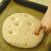 発酵した生地の表面にサラダ油又はオリーブ油をハケ塗りする。小指で押さえて所々にくぼみをつける。天然塩を表面に少し振り、焼き上げる。